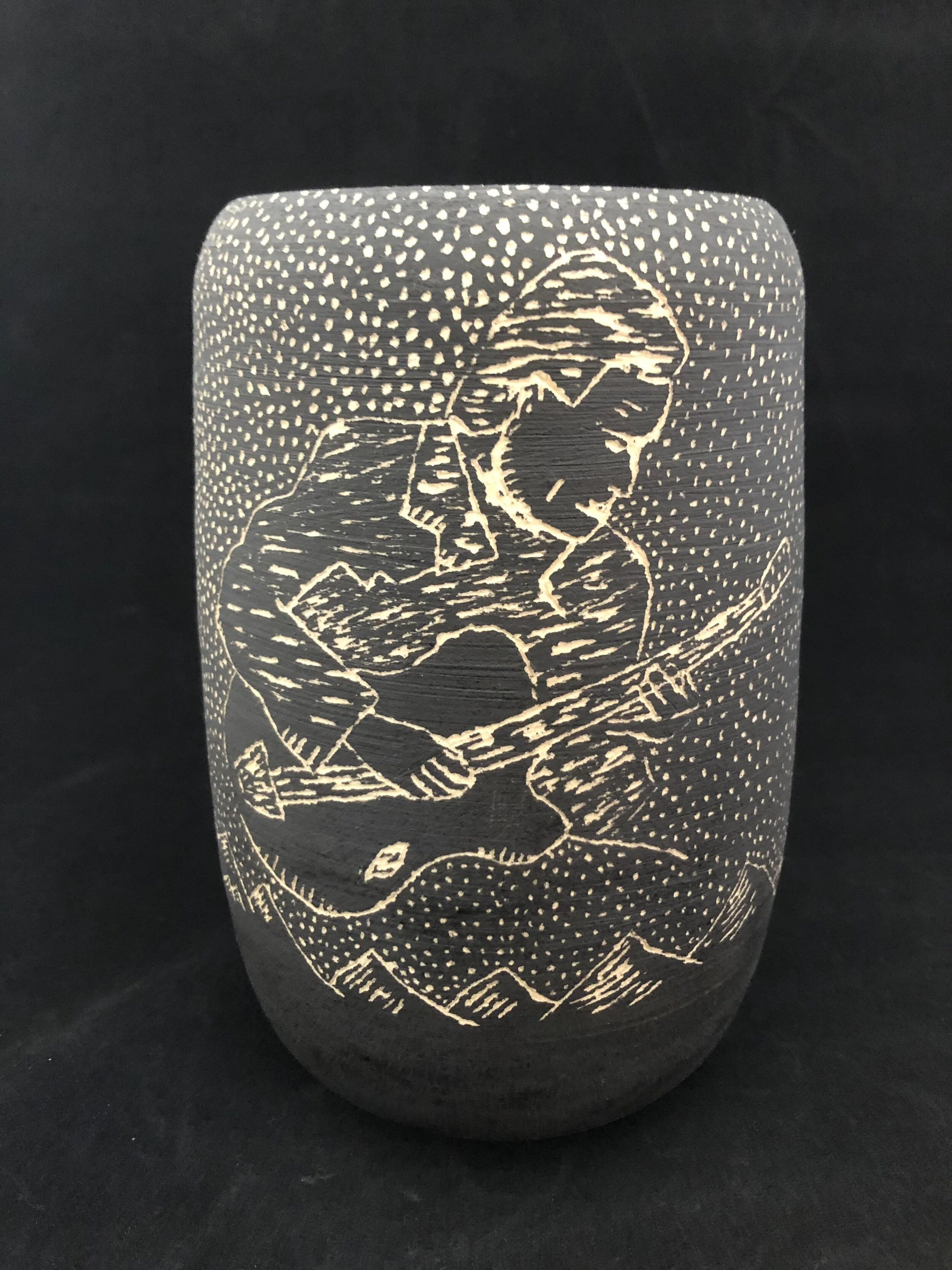 For my work, I wanted to focus on form as well as design and detail by spending hours on my illustrations that I carve into the surface of my piece using a technique called sgraffito where you underglaze the pot and carve to see the clay’s color underneath. My illustrations mostly consist of nature with occasional storytelling. The goal of my illustrations is to make the viewer come back and look for and notice more and more little details.